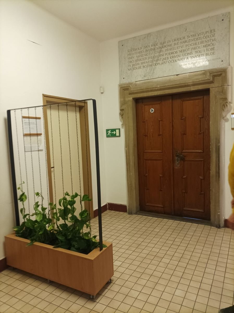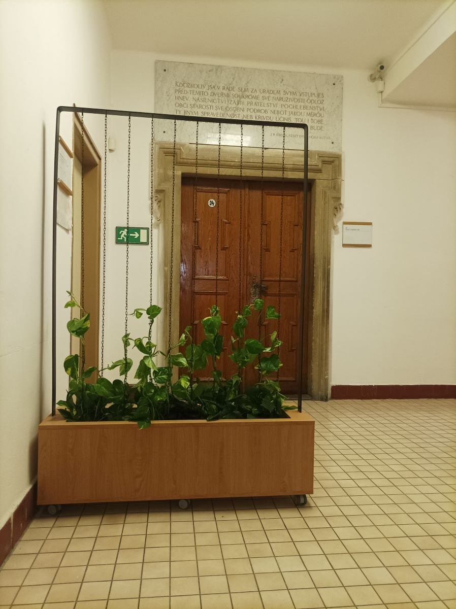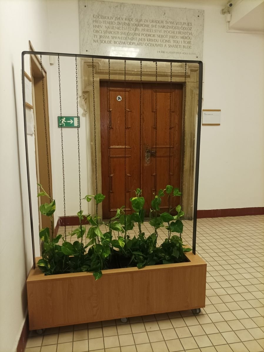 Zelené stěny jsou řešené jako dřevěné nádoby na kolečkách s lehkou ocelovou konstrukcí a svislými řetízky, po kterých se mohou rostliny pnout. Dekor dřeva jsme volili tak, aby ladil s už existujícím nábytkem a dveřmi z masivu. Místo kontrastu tak vzniklo přirozené propojení nového prvku s historickým prostředím. Výsadba je tvořená odolnými pokojovými rostlinami, které dobře zvládají chodby s proměnlivým světlem. Důležitou součástí projektu byla i lokální výroba. Celá konstrukce zelených stěn vznikla ve spolupráci s blanenskými firmami.