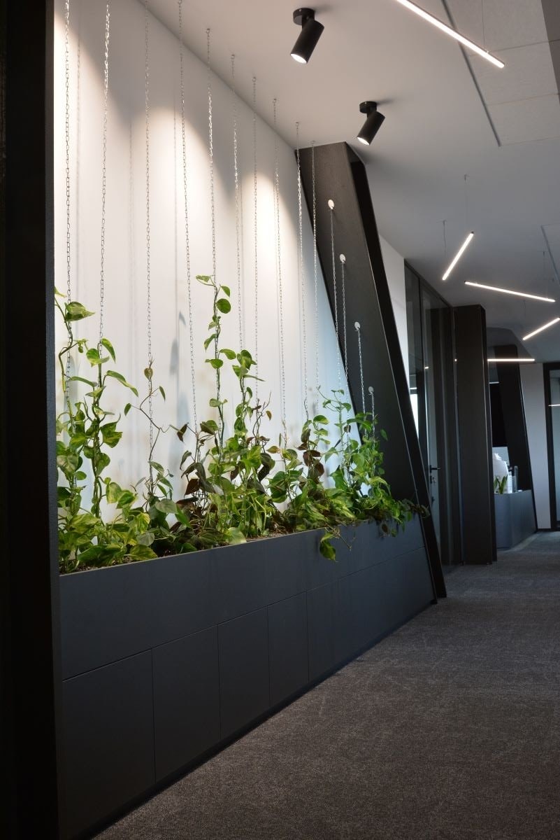 Pro zákazníka, který se zabývá autonomními systémy, jsme do chodeb a společných zón navrhli kombinaci popínavých rostlin vedených po jemných řetízcích pod stropem a nízkých výsadeb v truhlících. Zeleň se tak rozlévá prostorem, kopíruje linie osvětlení a konstrukcí a mění jinak technicistní interiér v příjemnou cestu mezi jednotlivými kancelářemi.