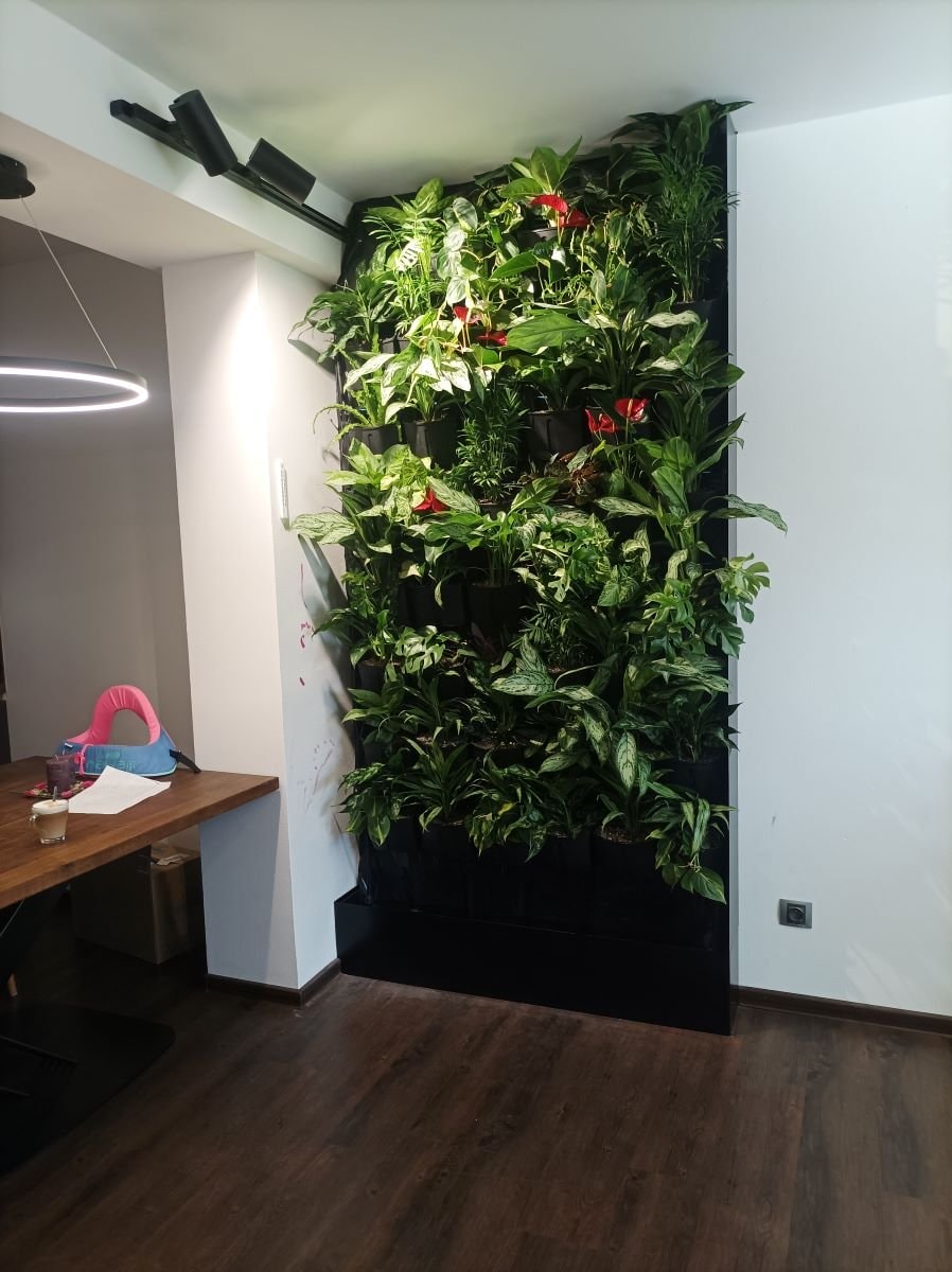 Pro našeho zákazníka jsme realizovali zelenou stěnu, která se perfektně hodí do interiéru rodinného domu. Snažili jsme se co nejvíce využít stávající podmínky: osvětlení jsme skryli za překlad, aby nerušilo stropní osvětlení, a elektroinstalaci jsme nechali bez změn. Stěna se dobře přizpůsobila, aniž by bylo třeba jakýchkoli zásahů do původní konstrukce.