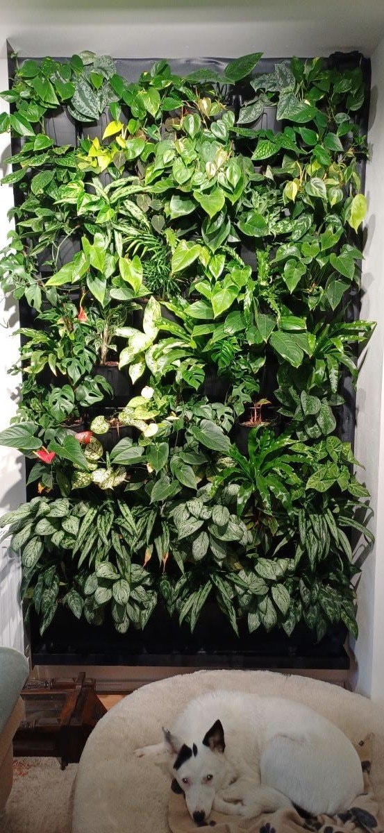 Stěna je osazena živými rostlinami a doplněna osvětlením, které podporuje jejich růst. Díky tomu se rostliny dobře rozvíjejí a stěna časem zcela zaroste. Řešení je navržené tak, aby vyžadovalo jen běžnou péči a dobře fungovalo i v domácím prostředí.